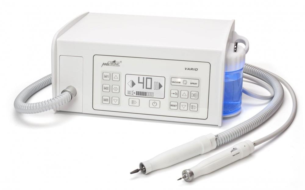 PodoTRONIC VARIO обладает большим дисплеем, на котором отображается вся необходимая информация для его быстрой настройки. Специальные тумблеры, установленные прямо на ручке аппарата, позволяют легко включать и выключать мотор. Для более тщательной очистки воздуха производителем были установлены фильтры. Также аппарат обладает дополнительным счетчиком для отображения уровня наполнения пылевого фильтра.