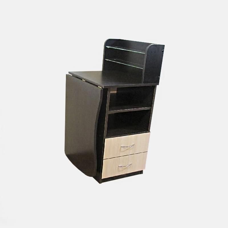 Складной маникюрный стол с тумбой "Ever" в сложенном виде занимает вдвое меньше пространства. Это экономит площадь и позволяет с комфортом работать даже в маленьких кабинетах. Есть вместительная тумба и полка под столешницей.
