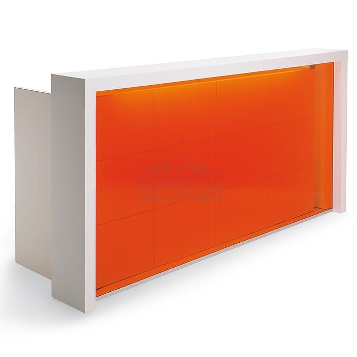 Стойка администратора. Фасад - желтое или молочное оргстекло с подсветкой, тумбы и столешница - дерево. Длина 160см или 210см.