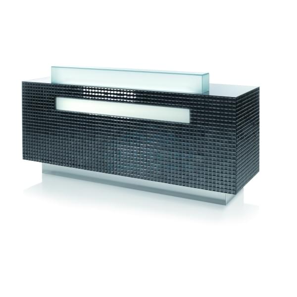 Стойка администратора. Фасад из керамической мозаики, на столешнице светильник из белого оргстекла.