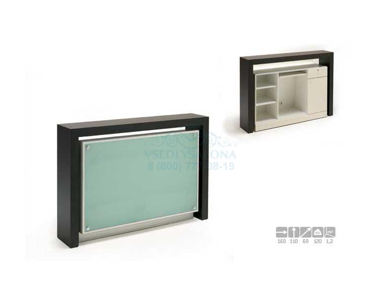 Стойка администратора с основанием из белого ламината, столешница выполнена из ламината цвета венге. Стеклянный фасад оснащен подсветкой. Комплектуется открытыми полками, ящиком с замком, тумбой с дверцей и выдвижной полкой для клавиатуры.