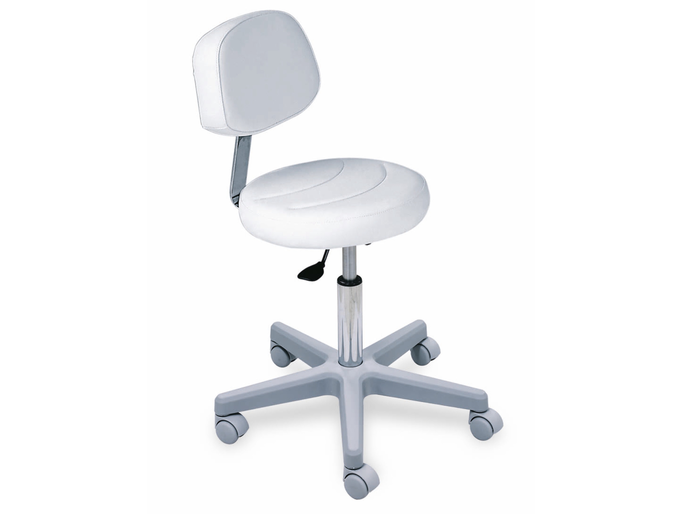 Оснащен регулируемой спинкой, пластиковым пятилучьем на колесах и газлифтом для регулировки высоты.