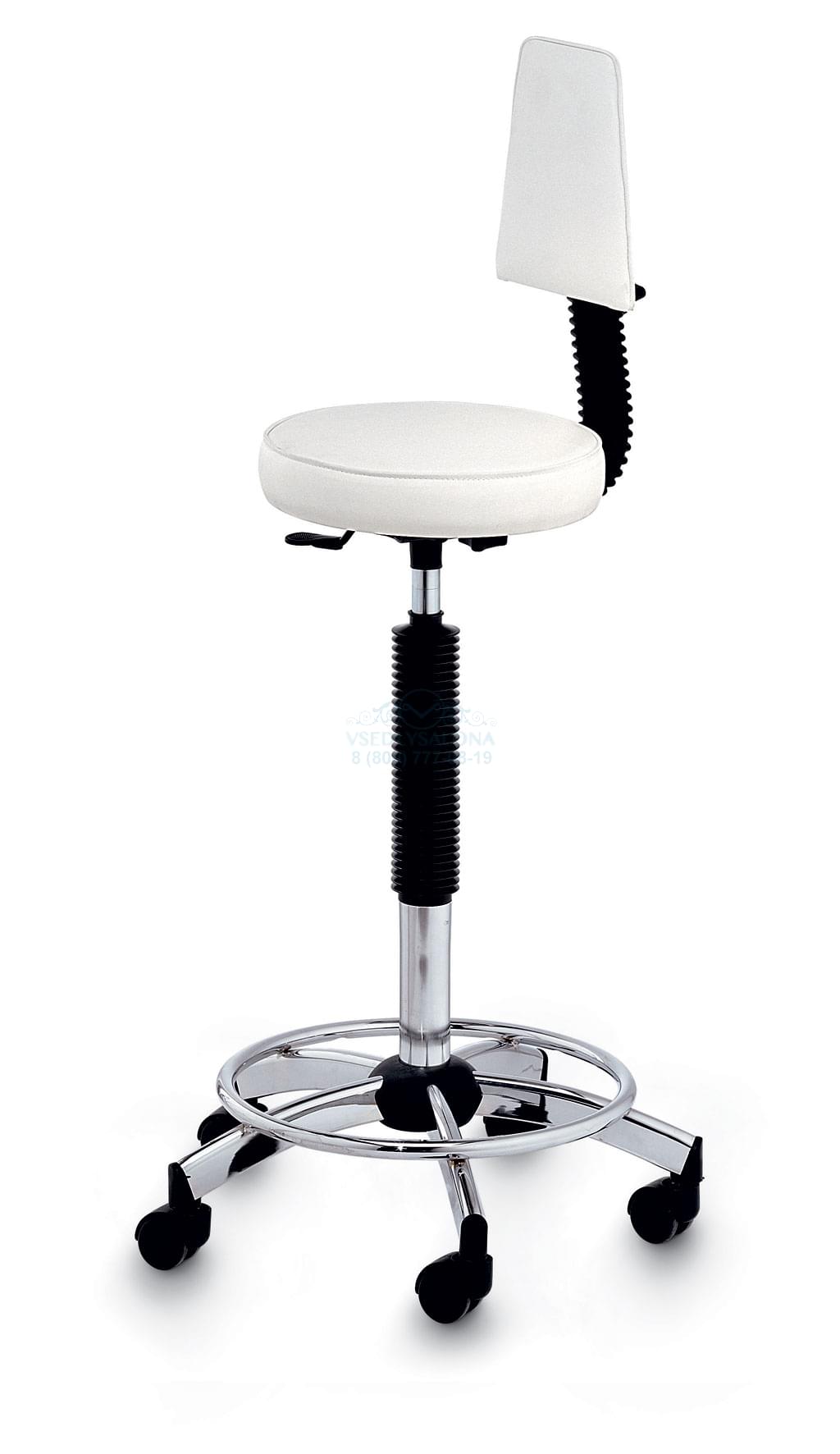Стул на пневматике и алюминиевом пятилучье с опорой под ноги на колесах. Стул с высокой прямоугольной спинкой и круглым сиденьем, с толстой и мягкой обивкой обтянутой кожзамом. Варианты цвета: белый, черный. Высота: мин 61 - макс 71 см.