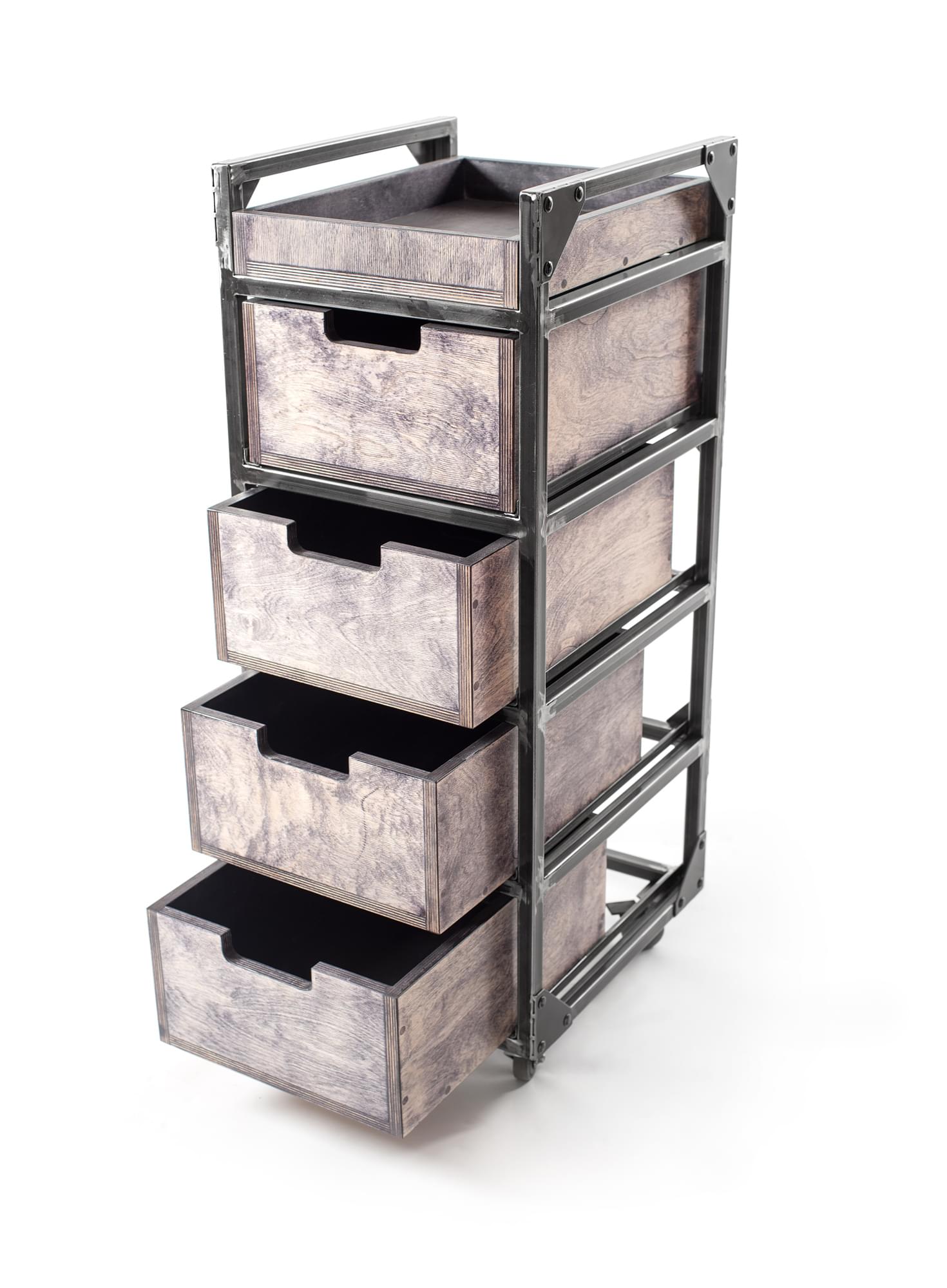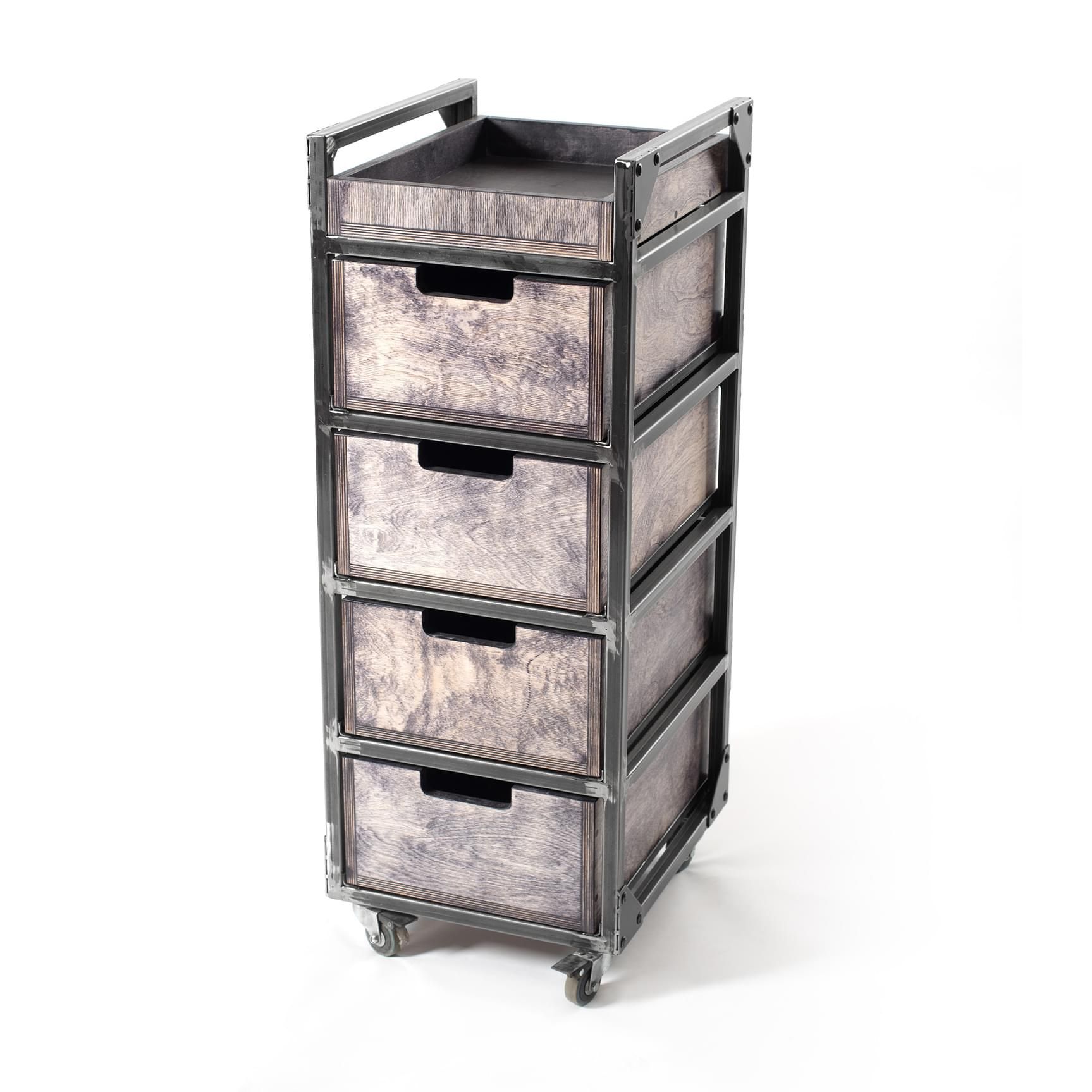 Рама тележки декорирована стальными накладками с заклепками. Колеса прорезиненные с тормозом. Полка и ящики выполнены из фанеры