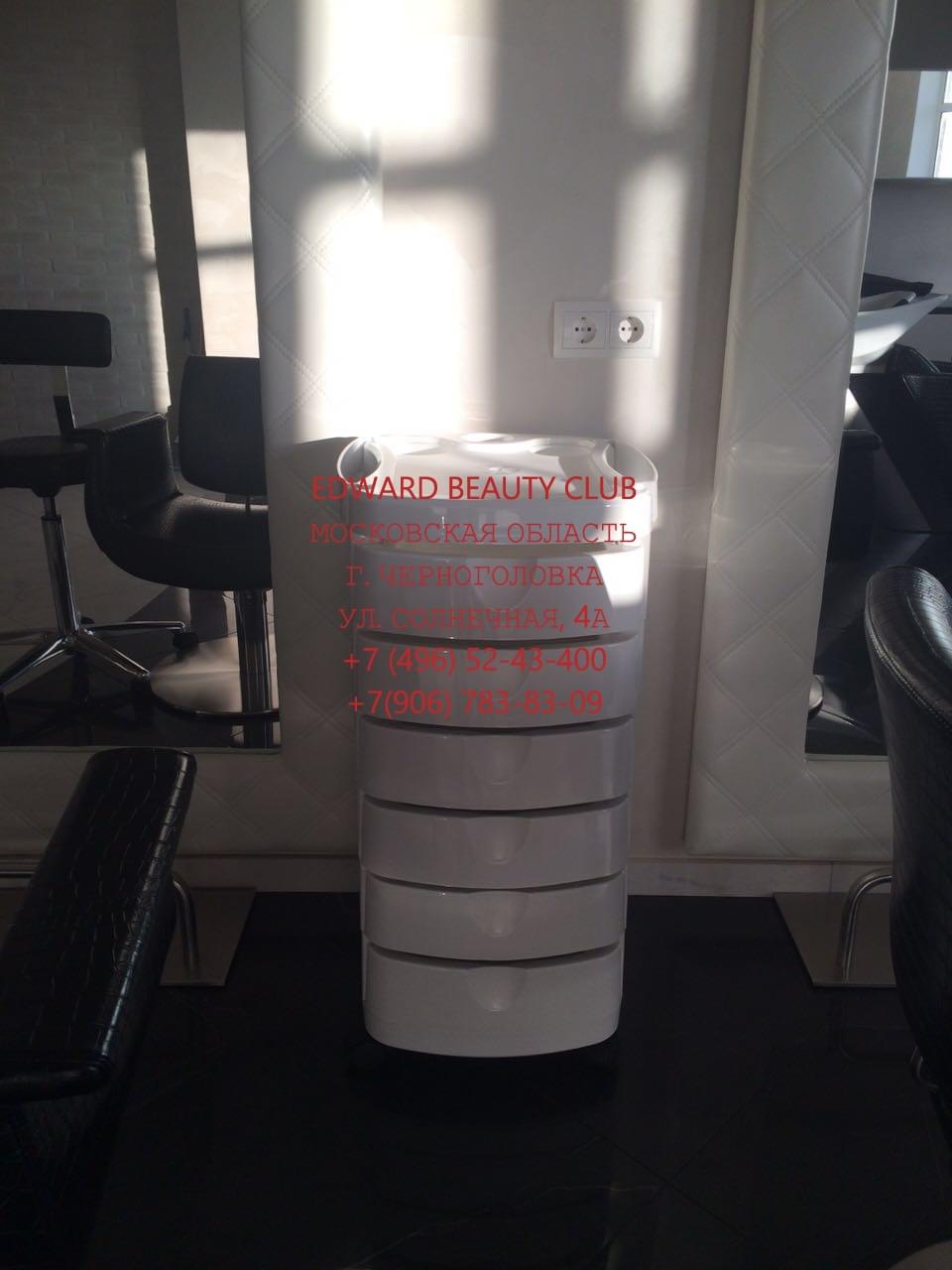 Тележка парикмахерская закрытого типа на колесиках. Выполнена из прочного пластика, с шестью выдвижными ящиками и фенодержателем.