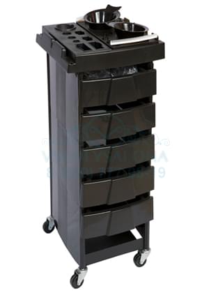 Парикмахерская тележка Т-30 оснащена глубокими и вместительными ящиками для парикмахерских принадлежностей, а также фенодержателем для еще большего удобства работы. Она выполнена в классическом черном цвете, что делает ее универсальной моделью практически для любой современной парикмахерской или барбершопа.