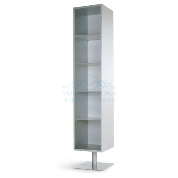 Витрина c пятью открытыми полками из белого или синего оргстекла. Выполнена из ламината, ножка металлическая.