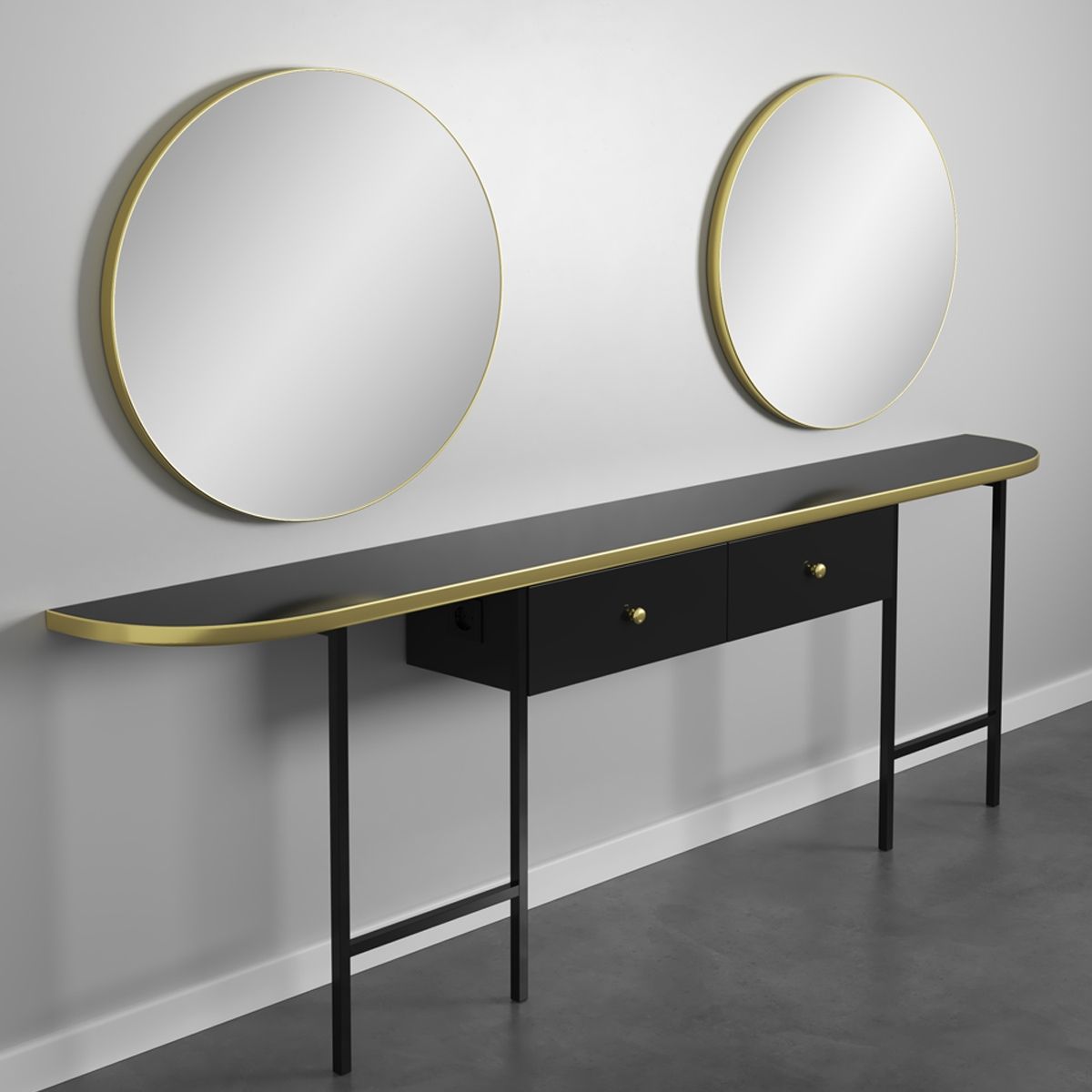 Зеркало парикмахерское "Betelgeuse Wall" - рамы из блестящего черного или золотого цвета. Круглое зеркало. Черная металлическая конструкция с черной верхней частью.