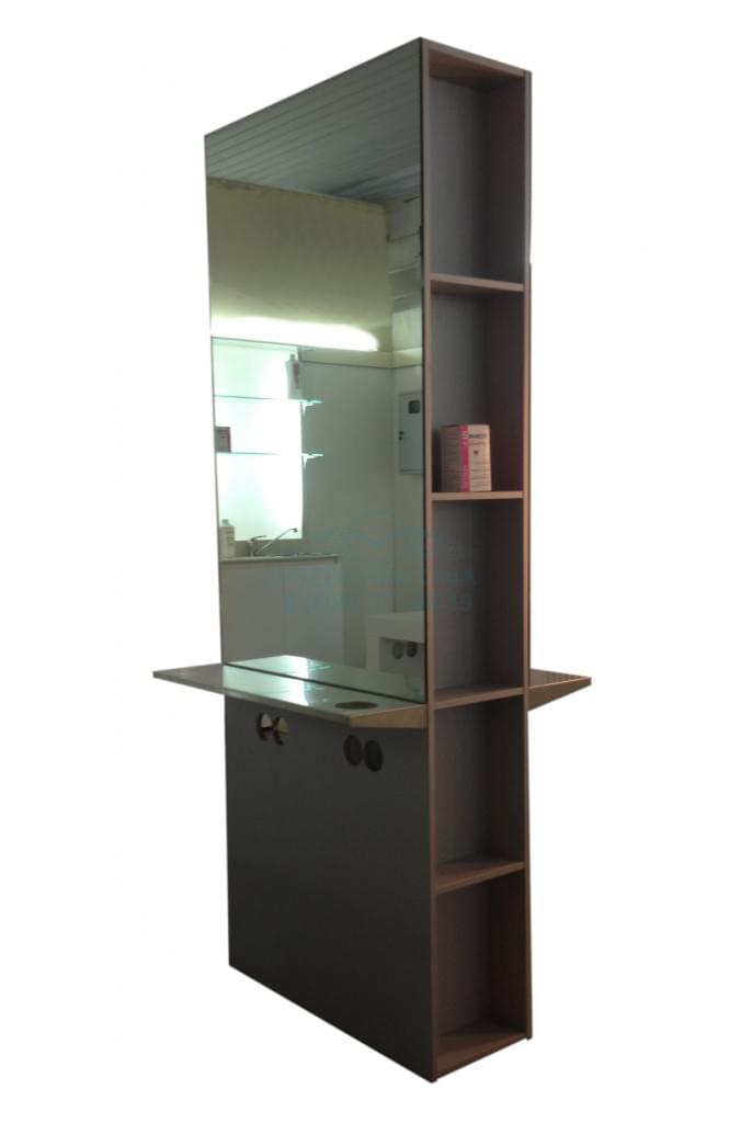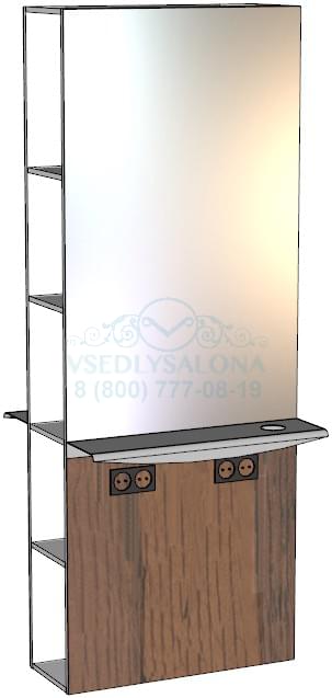 Материал и комплектация: силовой каркас из лдсп столешница из шлифованной нержавеющей стали (2 шт.) зеркало специальное (2 шт.) держатель для фена (2 шт.) витрина для продукции в торце зеркала