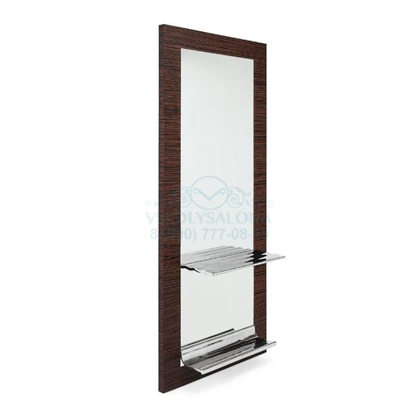 Зеркало парикмахерское, одностороннее, крепление к стене. Металлическая хромированная столешница и подставка под ноги, рама - дерево. Размер: 212х84х34